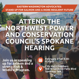 Please join us in urging the NW Power and Conservation Council to chart a course towards affordable, efficient, and reliable energy that also protects and restores abundant fish populations in its 2026 Fish & Wildlife Program. With continued efforts to weaken the Endangered Species Act, the 2026 Fish and Wildlife Program is the best path to mitigate further harm to fish from hydropower operations in the Columbia and Snake Rivers and make actionable progress towards recovery goals. Together, we can use our voices to ensure the Program is strong enough to achieve that goal. Go to tinyurl.com/npccSpokane for more resources and information.